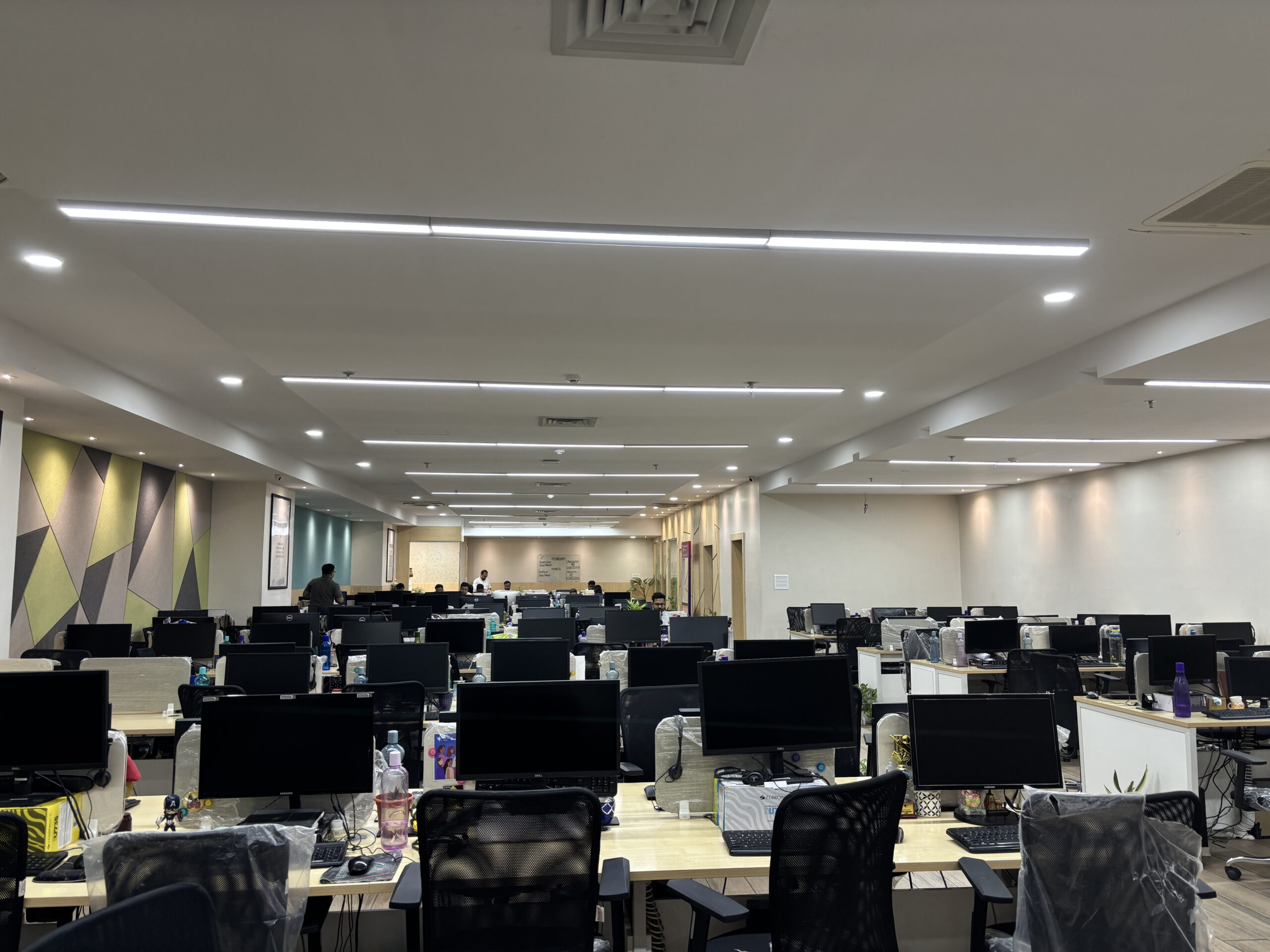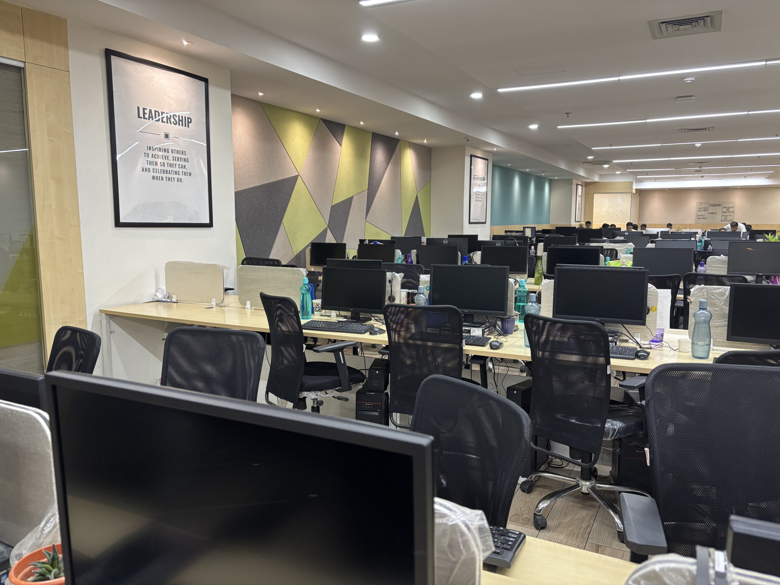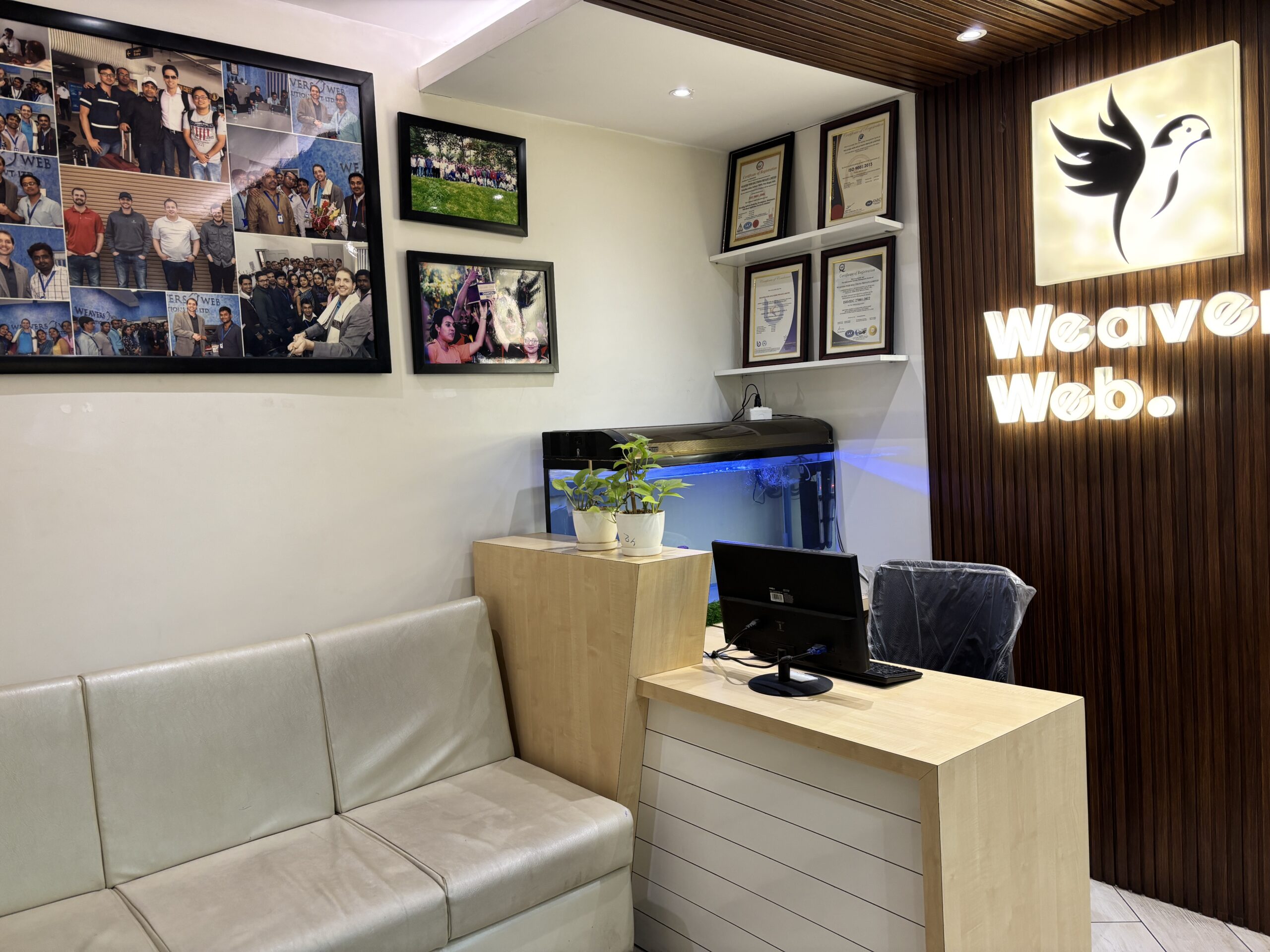 As a leading interior design company, our team had the opportunity to transform the office space at Weavers Web Solutions in Salt Lake into a functional yet aesthetically pleasing environment. The goal was to create a simplistic design that balanced practicality with style. For the reception area, we designed a welcoming setup with comfortable guest seating and a dedicated space for an aquarium, adding a touch of tranquility. To enhance brand visibility, we ensured the reception desk was well-illuminated, drawing attention to the company’s identity. Every element was carefully planned to ensure a seamless blend of functionality and elegance, creating an office space that is not just efficient but also visually appealing.